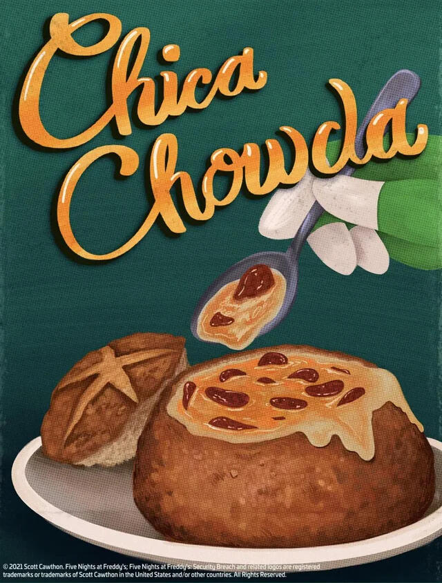 This dish is featured in Five Night's at Freddy's: Security Breach, as well as Five Night's at Freddy's Help Wanted 2. It's seen most notably on posters with Chica's hand, as well as featured in messages saying "Don't eat the chowda!" So of course, I had to eat the cowda.